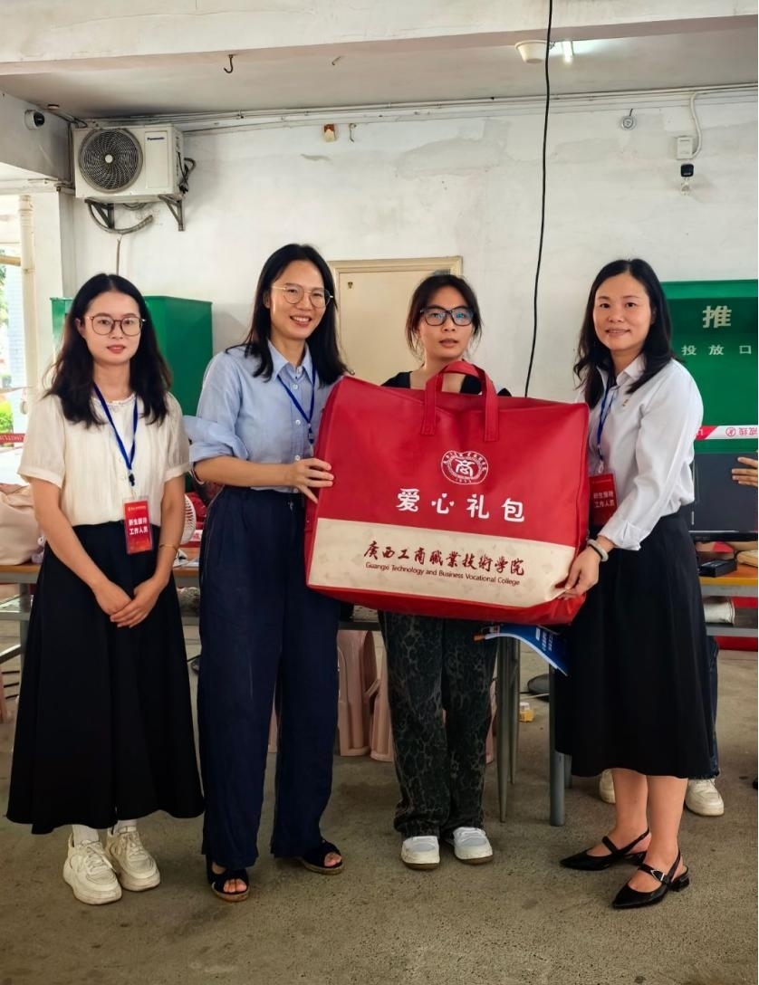 (智慧设计学院党总支张丽勇书记和学生党支部梁莉莉书记为新生发放爱心礼包)
