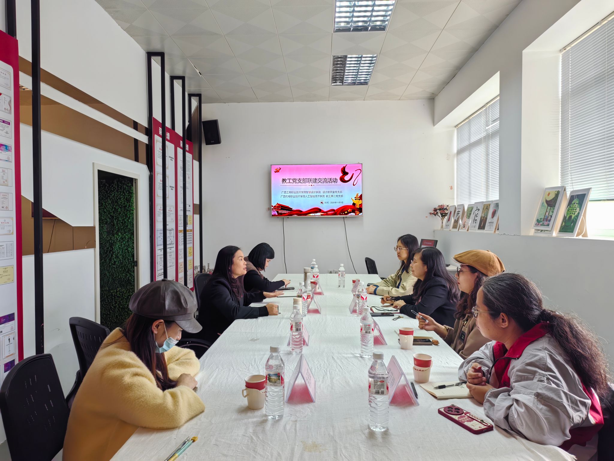 为推进广西高校“双带头人”教师党支部书记“强国行”专项行动落地见效,共同探索基层党支部建设新思路、新路径,实现组织互联、经验互鉴、资源互通、发展互促,2025年11月5日,智慧设计学院设计教研室党支部与广西机电职业技术学院人工智能技术学院教工第二党支部,在鹏飞校区2713工作室开展党建交流活动。智慧设计学院党总支书记、院长张丽勇,智慧设计学院设计教研室党支部书记李莹、广西机电职业技术学院人工智能技术学院教工第二党支部组织委员宋家慧,双方支部委员及党员教师代表共7人参加。