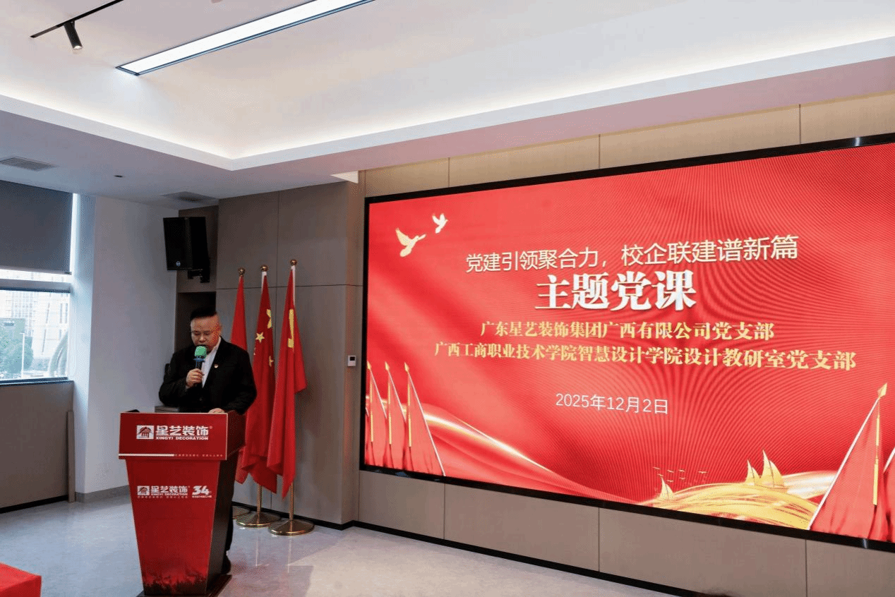 活动期间,星艺装饰公司吴传伟同志对参会嘉宾进行介绍,清晰梳理校企双方在技能人才培养、行业服务等领域的合作基础,明确以党建为纽带、助力设计专业高质量发展的核心目标,为校企协同推进后续工作搭建沟通桥梁。智慧设计学院设计教研室党支部书记李莹同志结合室内艺术设计专业发展实际与广西装饰行业趋势,围绕“十五五”职教规划开展专题党课讲授,并结合专业特色,引导同学们将党的二十届四中全会精神融入工作和学习,让“技能成长”与“思想涵养”在人才培养中相辅相成,为校企协同迈向未来锚定方向。