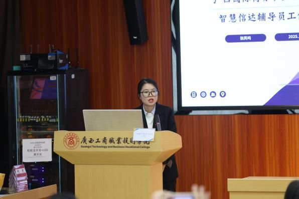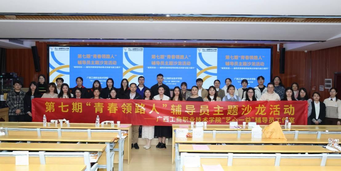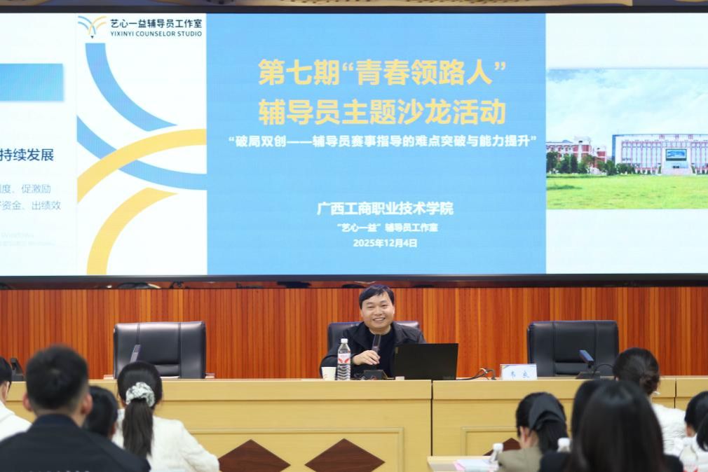 2025年12月4日,由广西工商职业技术学院艺心一益辅导员工作室承办的第七期“青春领路人”辅导员主题沙龙在鹏飞校区成功举行。本次沙龙以“破局双创——辅导员赛事指导的难点突破与能力提升”为主题,汇聚了区内多所高职院校的辅导员代表,旨在通过深度交流与智慧碰撞,共同破解指导难题,提升育人本领,强化辅导员作为学生成长“青春引路人”的使命担当。广西工商职业技术学院党委学生工作部(处)领导、各二级学院代表、全体专职辅导员及兄弟院校代表应邀参加。
