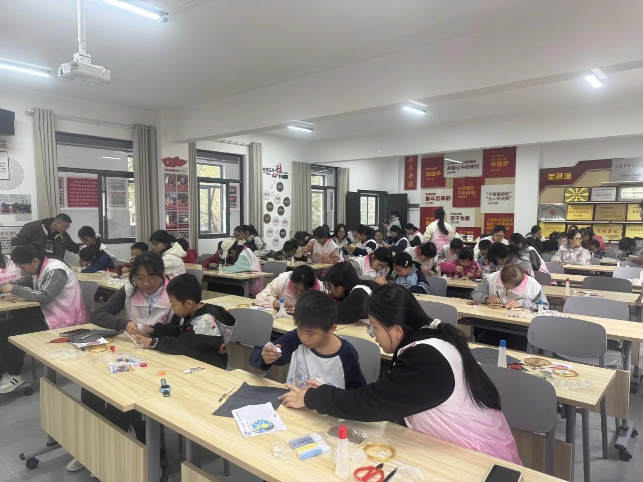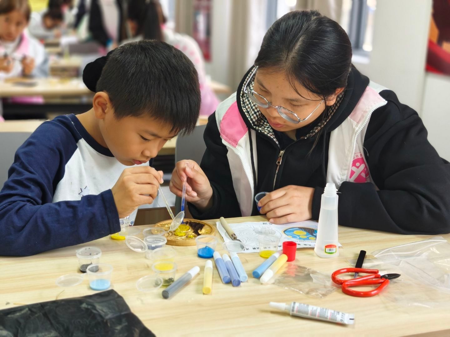 活动现场布置温馨雅致,铜丝、彩沙、固沙胶等材料整齐陈列。志愿者以趣味故事开篇,向孩子们科普掐丝珐琅的历史渊源与制作流程,结合展品演示铜丝勾勒、彩沙填充的核心技巧。动手实践环节精彩纷呈,志愿者化身 “非遗导师”,手把手指导小朋友们固定铜丝、调配彩沙、精准填充。孩子们发挥创意,或复刻传统花卉纹样,或设计个性撞色图案,孩子们始终专注投入,现场充满欢声笑语。经过近两小时创作,每位小朋友都收获了专属非遗作品,纷纷兴奋地展示,脸上洋溢着成就感。