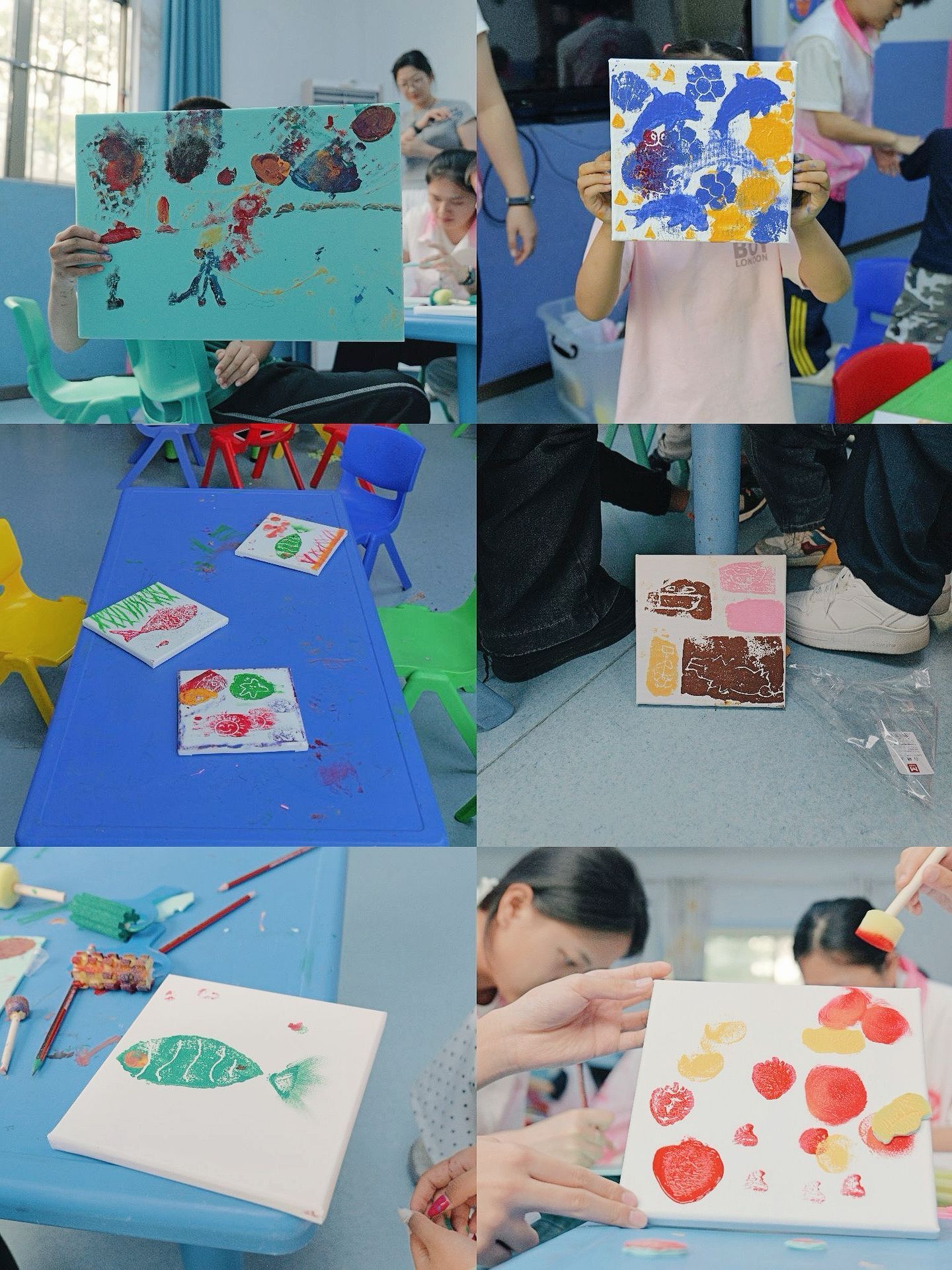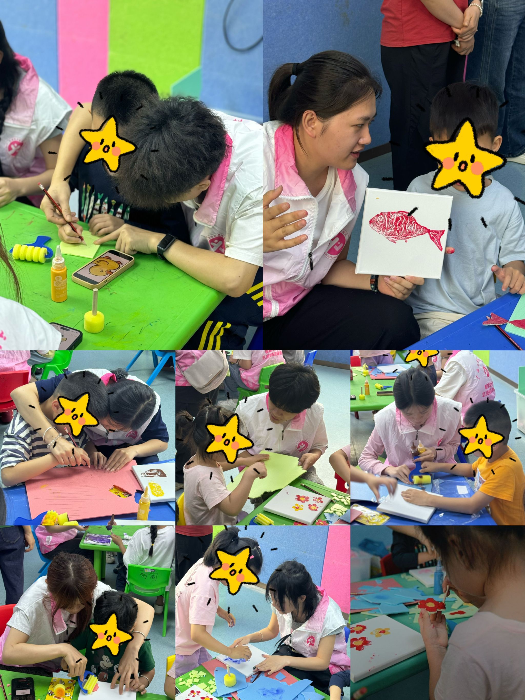 面对陌生的环境和新奇的工具,孩子们从最初的拘谨好奇,逐渐在志愿者的陪伴下放松下来。他们小手握着拓印工具,在画纸上认真创作,或印出可爱的花草,或留下斑斓的色块。没有固定的模板,没有标准的答案,每一幅作品都是孩子们内心最纯真的表达。志愿者们用心守护、细心鼓励,用微笑拉近与孩子们的距离,用陪伴化解陌生与不安。现场没有喧闹的话语,却有专注的眼神、默契的互动和温暖的笑声,艺术成为连接心灵的桥梁,让爱与温暖在指尖流淌。